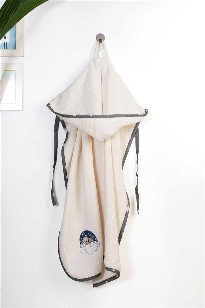 Βρεφική κάπα χρώματος εκρού διαστάσεων 75 x 85 cm, διακοσμημένη με χαριτωμένο κέντημα κοιμώμενο αρκουδάκι και χρωματιστό ρέλι με μοτίβο αστεράκια. Κατασκευασμένη από 100% βαμβακερή υποαλλεργική πετσέτα υψηλής απορροφητικότητας, βάρους 400 gr/m² ελεγμένη για επιβλαβείς ουσίες με το παγκοσμίως αναγνωρισμένο πιστοποιητικό, OEKO TEX® Standard 100. Η απαλή υφή της προσφέρει την ιδανική φροντίδα, ενώ η ενσωματωμένη κουκούλα κρατάει το κεφαλάκι του μωρού ζεστό. Συσκευασία δώρου: κουτί πολυτελείας.