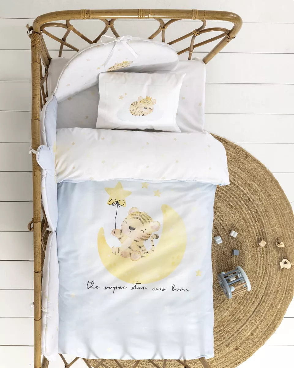 Κουβερλί κούνιας με γλυκό τιγράκι, κατασκευασμένο από 100% φυσικό βαμβάκι 144tc. η απαλή υφή του το καθιστά ιδανικό για την ευαίσθητη βρεφική επιδερμίδα, ενώ η φυσική του σύνθεση προσφέρει υποαλλεργική προστασία και απόλυτη φιλικότητα προς το δέρμα. η εσωτερική βάτα εξασφαλίζει ιδανική θερμοκρασία και άνεση καθ’ όλη τη διάρκεια του ύπνου, χωρίς να βαραίνει το μωρό. ο πρακτικός σχεδιασμός του προσφέρει εύκολη χρήση, ενώ η κομψή του εμφάνιση συμπληρώνει αρμονικά το βρεφικό δωμάτιο.