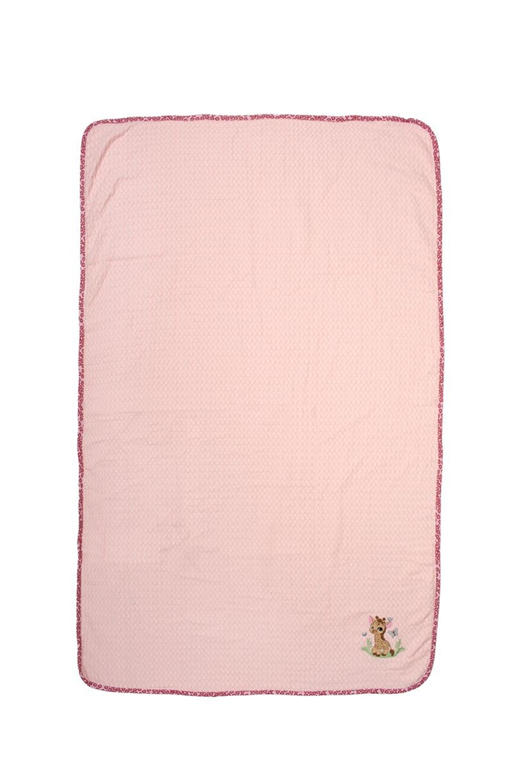 Βρεφική κουβέρτα πικέ κούνιας με ανάγλυφο σχέδιο βάφλα, χρώματος ροζ, διαστάσεων 100 x 160 cm, διακοσμημένη με χαριτωμένο κέντημα καμηλοπάρδαλη και χρωματιστό ρέλι με μοτίβο καρδούλες. Κατασκευασμένη από 100% βαμβακερό, υποαλλεργικό woven πικέ ύφασμα βάρους 325 gr/m². Χάρη στην εξαιρετικά απαλή υφή της, αγκαλιάζει το μωρό σας με άνεση, ενώ η ιδιαίτερη ύφανση βάφλα επιτρέπει στο δέρμα να αναπνέει, καθιστώντας την ιδανική επιλογή για την άνοιξη και το καλοκαίρι. Συσκευασία δώρου: κουτί πολυτελείας. Η κουβέρτα είναι ελεγμένη για επιβλαβείς ουσίες με το παγκοσμίως αναγνωρισμένο πιστοποιητικό OEKO-TEX® Standard 100.