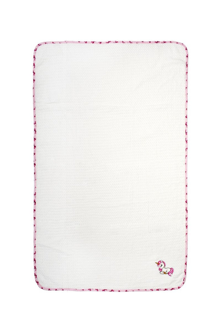 Βρεφική κουβέρτα πικέ αγκαλιάς με ανάγλυφο σχέδιο βάφλα, χρώματος λευκού, διαστάσεων 80 x 110 cm, διακοσμημένη με χαριτωμένο κέντημα μονόκερο και χρωματιστό ρέλι με μοτίβο κορδελίτσες. Κατασκευασμένη από 100% βαμβακερό, υποαλλεργικό woven πικέ ύφασμα βάρους 325 gr/m². Χάρη στην εξαιρετικά απαλή υφή της, αγκαλιάζει το μωρό σας με άνεση, ενώ η ιδιαίτερη ύφανση βάφλα επιτρέπει στο δέρμα να αναπνέει, καθιστώντας την ιδανική επιλογή για την άνοιξη και το καλοκαίρι. Συσκευασία δώρου: κουτί πολυτελείας. Η κουβέρτα είναι ελεγμένη για επιβλαβείς ουσίες με το παγκοσμίως αναγνωρισμένο πιστοποιητικό OEKO-TEX® Standard 100.