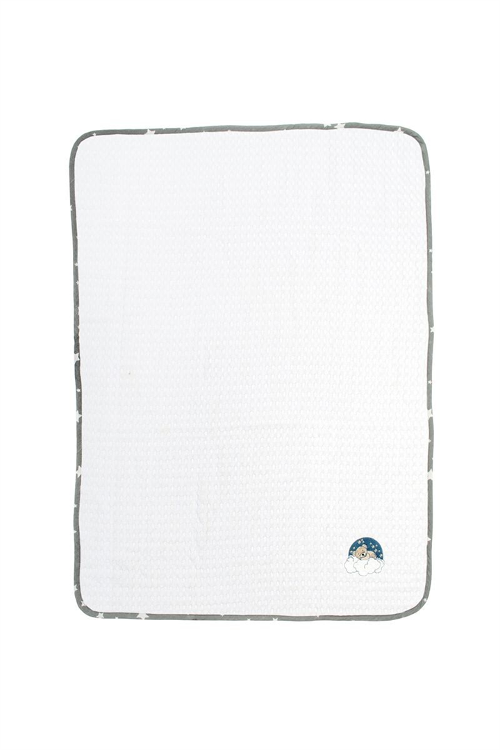 Βρεφική κουβέρτα πικέ κούνιας με ανάγλυφο σχέδιο βάφλα, χρώματος λευκού, διαστάσεων 100 x 160 cm, διακοσμημένη με χαριτωμένο κέντημα κοιμώμενο αρκουδάκι και χρωματιστό ρέλι με μοτίβο αστεράκια. Κατασκευασμένη από 100% βαμβακερό, υποαλλεργικό woven πικέ ύφασμα βάρους 325 gr/m². Χάρη στην εξαιρετικά απαλή υφή της, αγκαλιάζει το μωρό σας με άνεση, ενώ η ιδιαίτερη ύφανση βάφλα επιτρέπει στο δέρμα να αναπνέει, καθιστώντας την ιδανική επιλογή για την άνοιξη και το καλοκαίρι. Συσκευασία δώρου: κουτί πολυτελείας. Η κουβέρτα είναι ελεγμένη για επιβλαβείς ουσίες με το παγκοσμίως αναγνωρισμένο πιστοποιητικό OEKO-TEX® Standard 100.