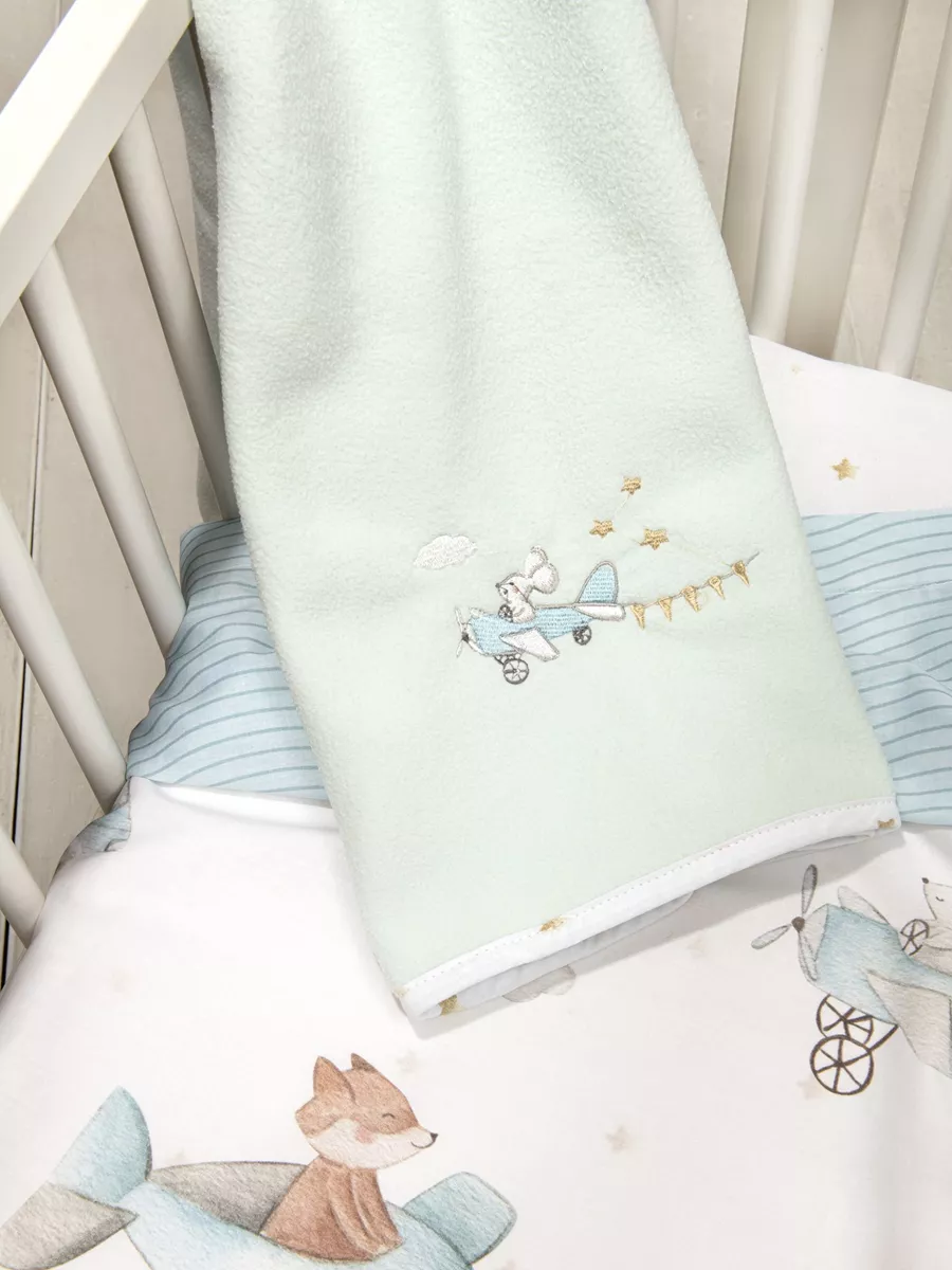 Η βρεφική κουβέρτα joy ride ζωντανεύει με ένα γλυκό και παιχνιδιάρικο κεντητό σχέδιο που απεικονίζει ένα χαριτωμένο ποντικάκι να πετά με το αεροπλανάκι του. Μια σειρά από διακοσμητικά σημαιάκια και χρυσαφένιους αστερισμούς προσθέτουν μια νότα χαράς και φαντασίας, ενώ μικρά, αφράτα σύννεφα συμπληρώνουν το ονειρικό σκηνικό. Το βασικό χρώμα της κουβέρτας είναι ένα γαλήνιο απαλό χρώμα της μέντας, που δημιουργεί μια ήρεμη και χαλαρωτική ατμόσφαιρα. Η βρεφική κουβέρτα "joy ride" είναι μια πηγή ζεστασιάς, άνεσης και έμπνευσης για τους μικρούς μας φίλους!