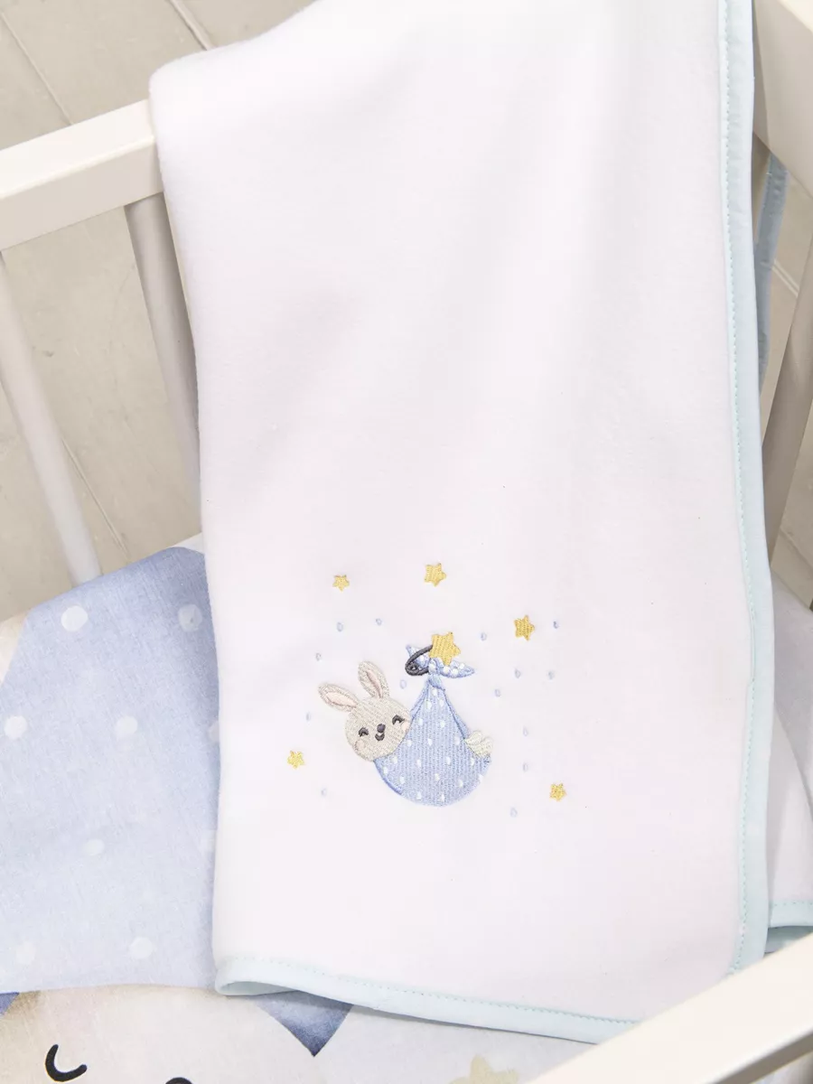 Η βρεφική κουβέρτα little mister είναι απαλή σαν χάδι και ζεστή σαν αγκαλιά! Απαραίτητη όλες τις εποχές του χρόνου και κατάλληλη για το κρεβατάκι, το καρότσι ή και τις αγκαλιές στον καναπέ! Έχει υπέροχο κέντημα που απεικονίζει ένα γλυκό κουνελάκι κάτω από τ’ αστέρια και χαρίζει τρυφερότητα και χαμόγελα. Χάρη στην εξαιρετική της ποιότητα, παραμένει απαλή μετά από κάθε πλύσιμο, ενώ η κομψή διχρωμία με γαλάζιο ρέλι προσθέτει μια δροσερή και φινετσάτη πινελιά. Συνδυάστε την με τα ασορτί σεντονάκια ή την πάντα για ένα ονειρεμένο βρεφικό δωμάτιο!