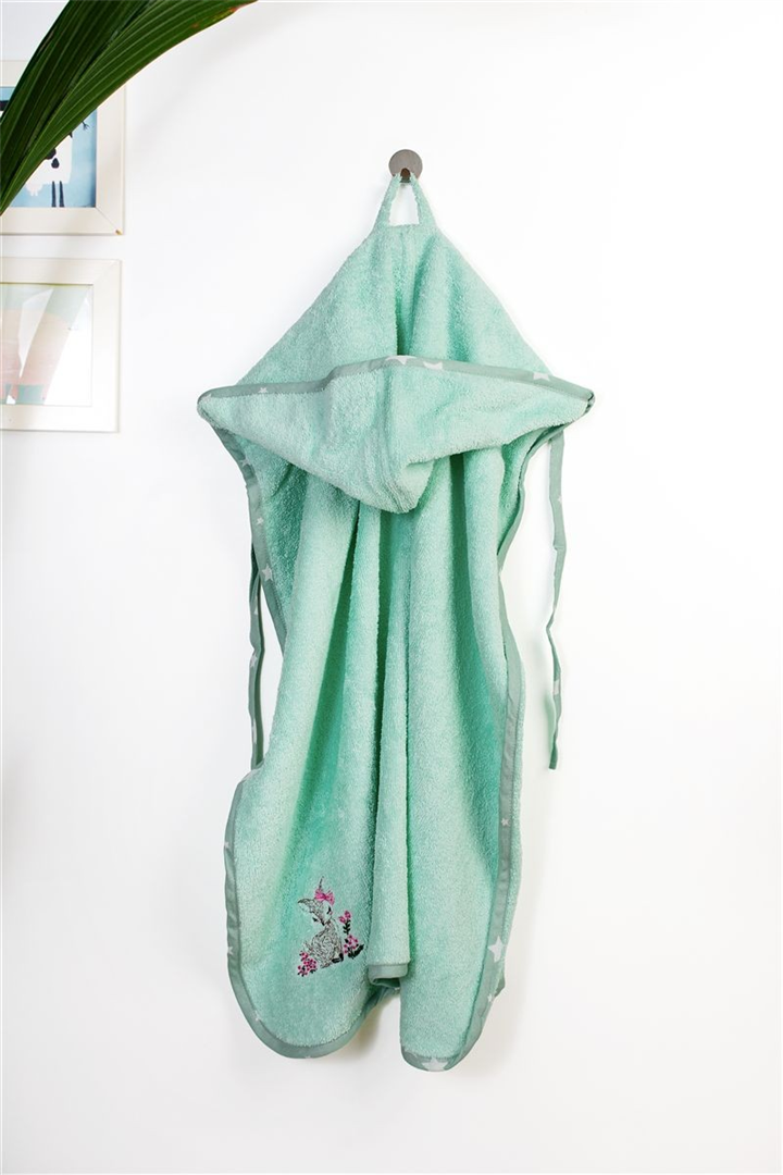 Βρεφική κάπα χρώματος μέντας διαστάσεων 75 x 85 cm, διακοσμημένη με χαριτωμένο κέντημα ελαφάκι και χρωματιστό ρέλι με μοτίβο αστεράκια. Κατασκευασμένη από 100% βαμβακερή υποαλλεργική πετσέτα υψηλής απορροφητικότητας, βάρους 400 gr/m² ελεγμένη για επιβλαβείς ουσίες με το παγκοσμίως αναγνωρισμένο πιστοποιητικό, OEKO TEX® Standard 100. Η απαλή υφή της προσφέρει την ιδανική φροντίδα, ενώ η ενσωματωμένη κουκούλα κρατάει το κεφαλάκι του μωρού ζεστό. Συσκευασία δώρου: κουτί πολυτελείας.